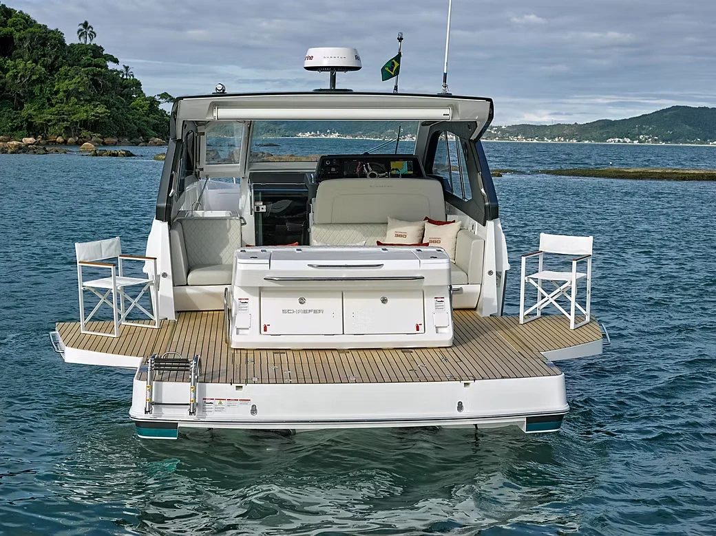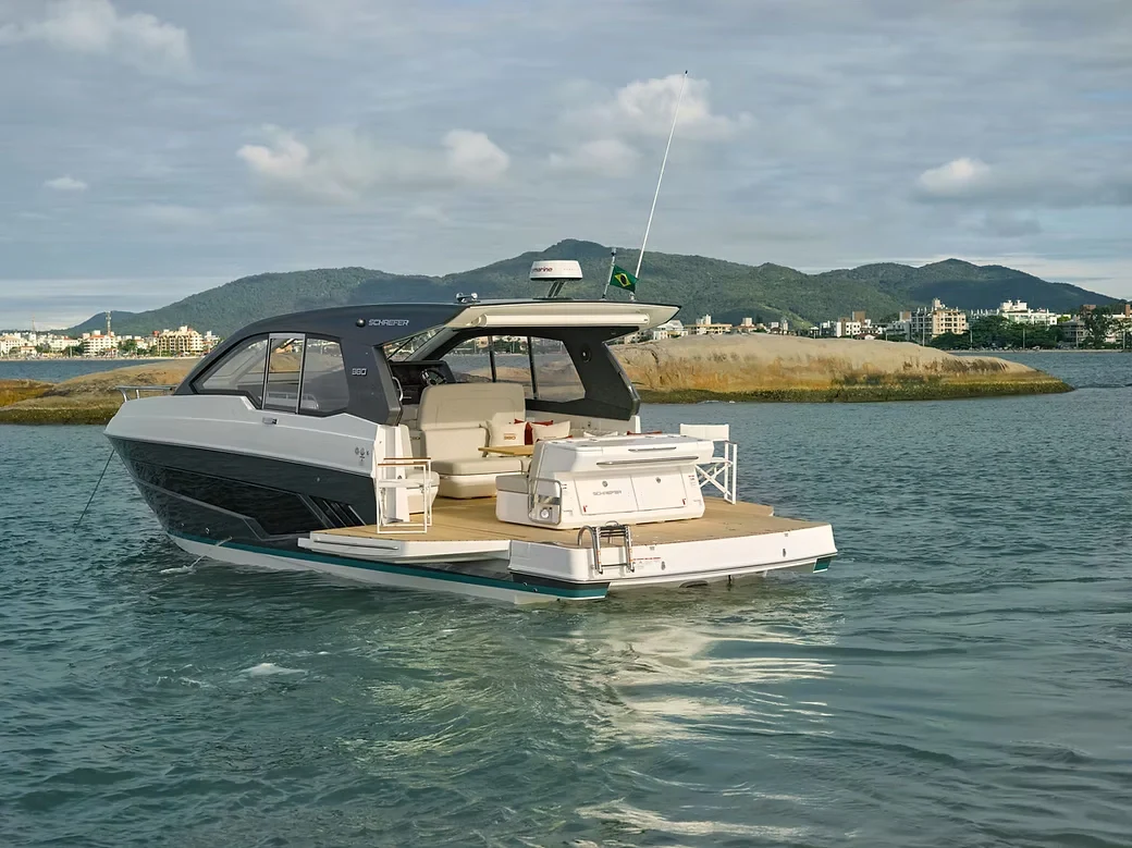 A Schaefer 380 é um dos maiores sucessos do estaleiro catarinense, unindo sofisticação e esportividade em um design de linhas fluidas e contemporâneas. Como uma embarcação cabinada sem flybridge, ela aposta em um perfil aerodinâmico e elegante, sendo uma referência absoluta de prestígio no mercado náutico brasileiro.