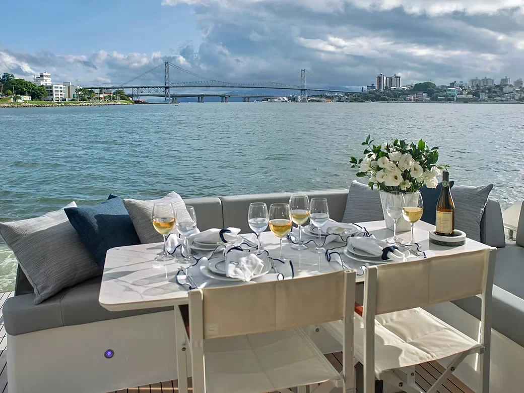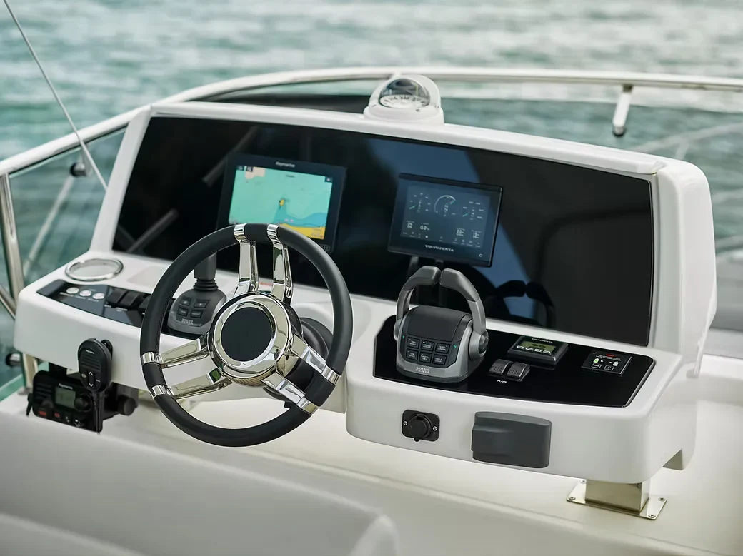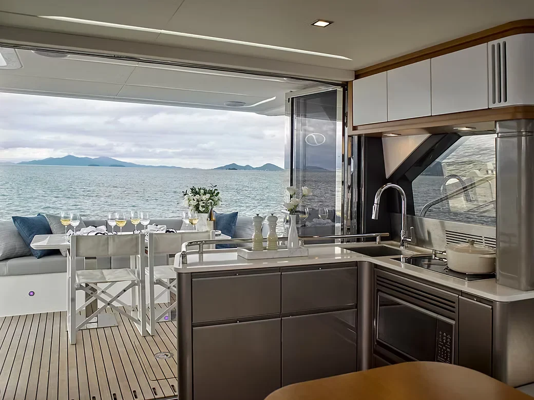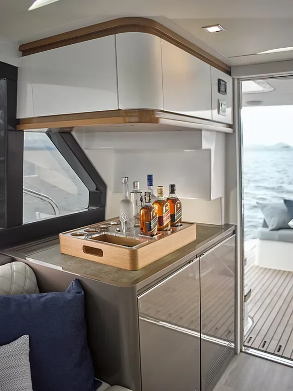 No interior, o foco é o conforto absoluto e a amplitude. A cabine é banhada por luz natural graças às generosas superfícies envidraçadas, criando uma conexão contínua com o horizonte. O aproveitamento inteligente de espaço permite áreas de convivência refinadas e integradas, ideais para quem busca hospitalidade e bem-estar em alto-mar.