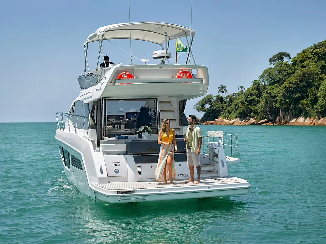 No comando, a performance é precisa e fluida, refletindo a engenharia de ponta que consagrou o estaleiro. O flybridge oferece uma visão privilegiada e um ambiente extra de lazer ao ar livre, consolidando a Schaefer 450 como uma das embarcações mais equilibradas e desejadas de sua categoria.