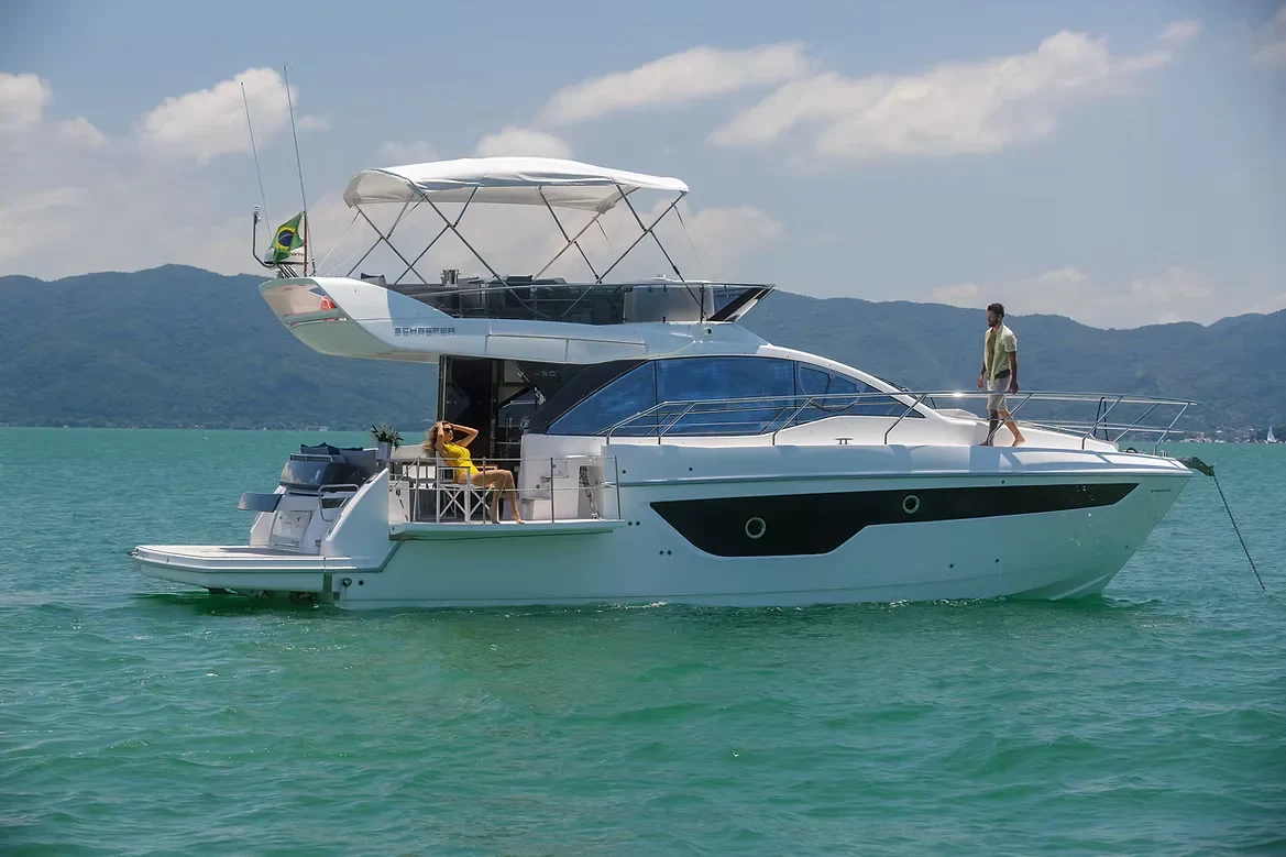 A Schaefer 450 é a personificação do luxo contemporâneo no mercado náutico brasileiro. Com o DNA de sofisticação da Schaefer Yachts, este modelo flybridge destaca-se por suas linhas aerodinâmicas e um design exterior que equilibra perfeitamente imponência e elegância rítmica sobre as águas.