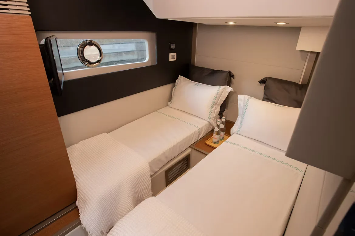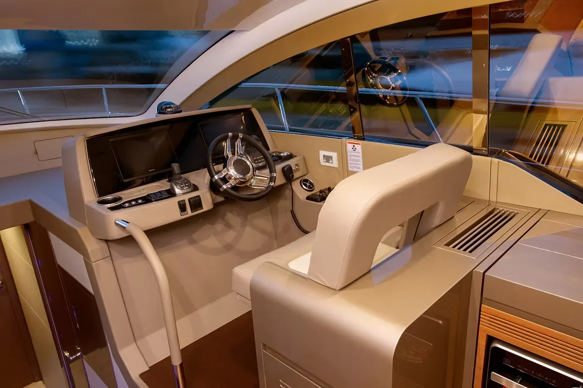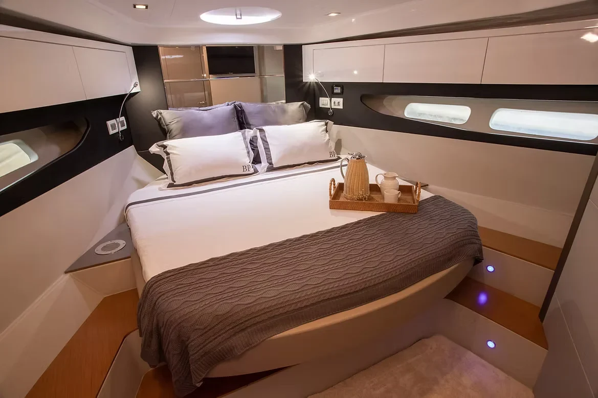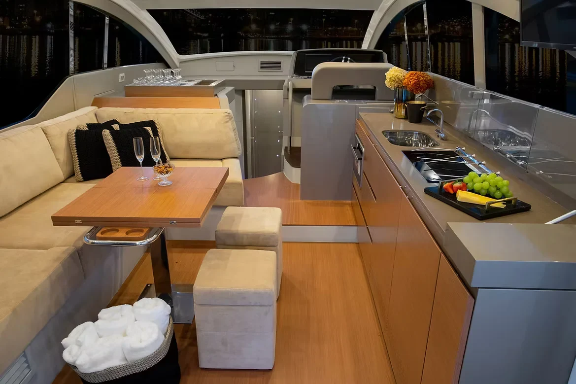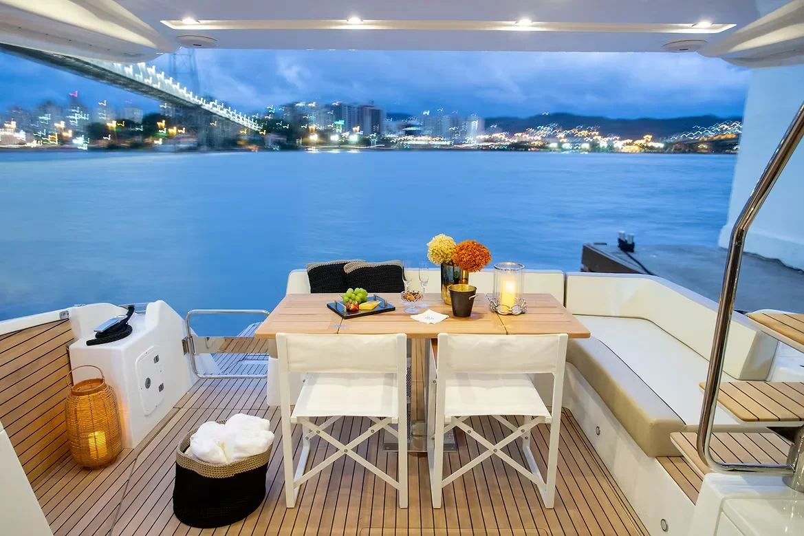 O grande destaque deste modelo é o equilíbrio entre o luxo de sua cabine e a amplitude do **Flybridge**. O espaço superior é um convite ao convívio social, oferecendo uma vista privilegiada e uma área de lazer completa para aproveitar os dias de sol. Internamente, o acabamento refinado e o uso inteligente dos espaços garantem um conforto excepcional para pernoite e longos períodos de navegação.
