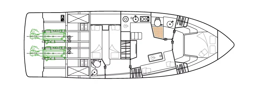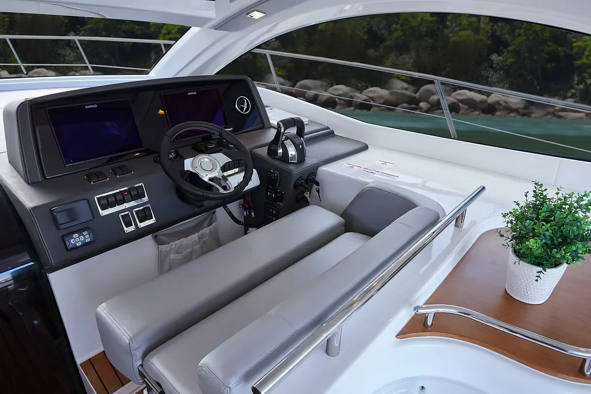 O grande destaque deste modelo está na integração inteligente dos espaços. A ausência do flybridge acentua o perfil esportivo e permite um cockpit amplo e fluido, onde o teto solar retrátil transforma a área social em um lounge iluminado e ventilado, ideal para quem valoriza a convivência próxima ao mar.
