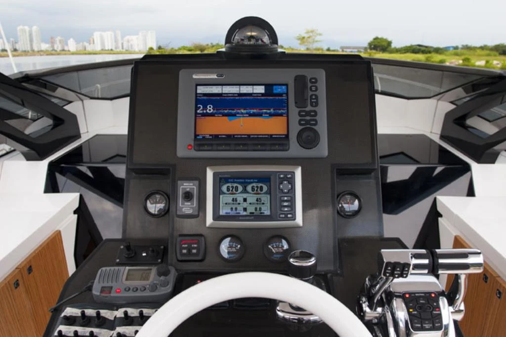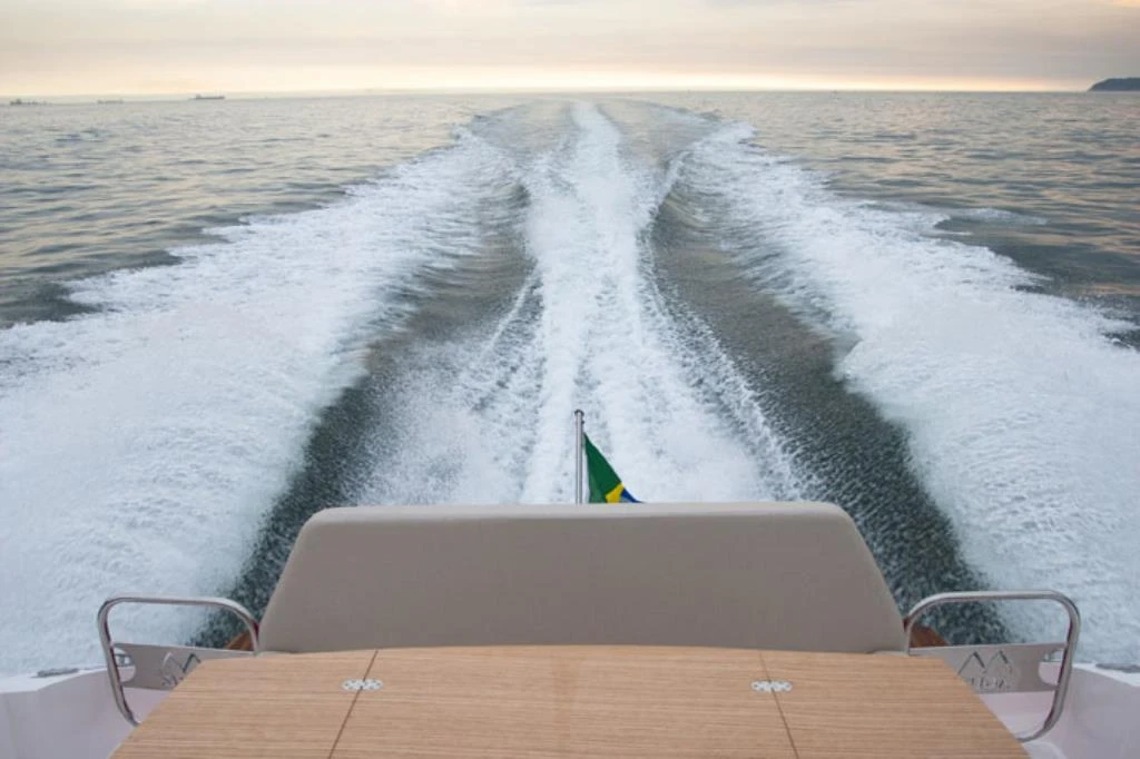 A Aguz 39 Sport é uma lancha cabinada fabricada inteiramente no Brasil, que mudou a paisagem do litoral do nosso país, destacando-se pelo design impecável e moderno, ao mesmo tempo fino e agressivo, com grandes áreas envidraçadas. A Aguz 39 foi criada à partir do projeto de um renomado estúdio de design italiano. Ela tem DNA, tem pedigree. A Aguz 39 Sport pode ser configurada com capota rígida de fibra, o T-Top, ou com a capota de lona com estrutura em inox, com ou sem fechamento total.