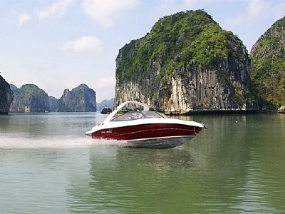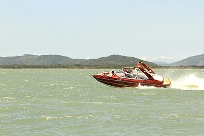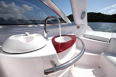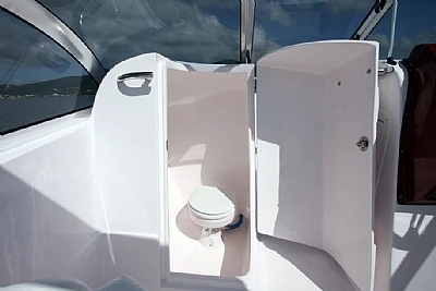 Banheiro fechado, com WC manual de série e o maior pé-direito da categoria. Casco com sistema de aperfeiçoamento de desempenho Step-Vee: planeio mais rápido e maior velocidade final. Motorização centro-rabeta: mais espaço, mais conforto, menos ruído e direção hidráulica de série em todos os motores. Plataforma de mergulho integrada ao convés, aumentando a área útil da embarcação em 5 pés. Embarcação homologada para 10 pessoas. Excelente autonomia: 150L de combustível e 60L de água doce. Estofamento em courvim anti mofo com opções em branco, neve, areia e caramelo, quebrando as antigas tendências de cores homogêneas. Acabamento refinado, e peças desenhadas em harmonia com a embarcação.