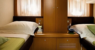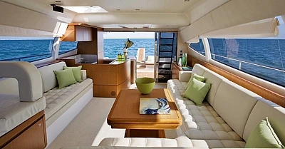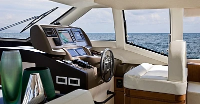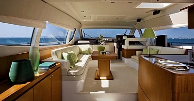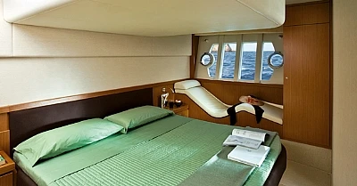 Existem três inovações revolucionárias no Ferretti 530: a cabine principal com chaise longue e duas janelas largas de visão aberta que a faz uma verdadeira suíte no nível do mar, banhada de luz, tons e as essências naturais da madeira Teca