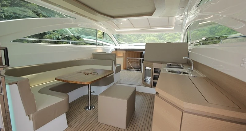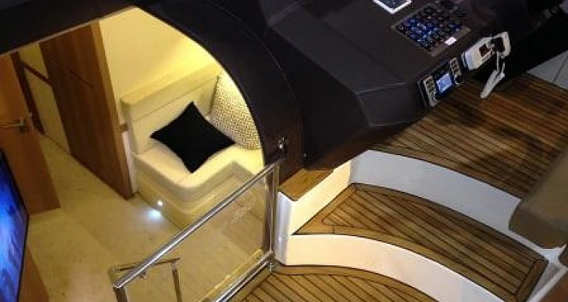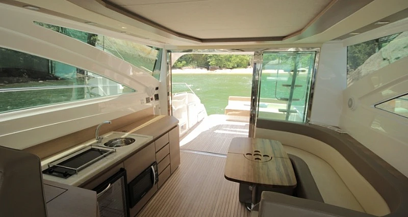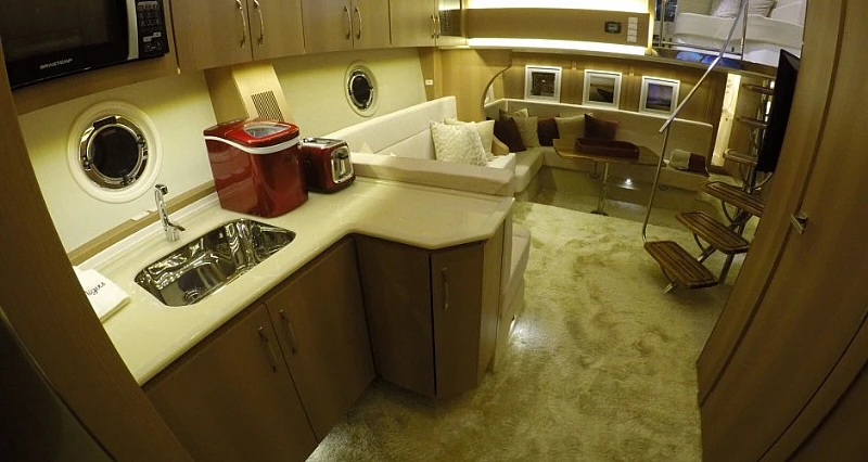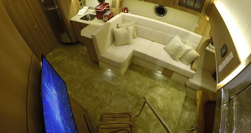 O aproveitamento do espaço desta lancha é um dos pontos fortes deste modelo, e o pé direito da cabine proporciona amplitude e conforto e conta com exclusivo quarto e banheiro para o marinheiro.